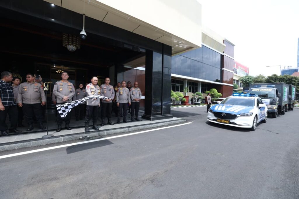 Pelepasan bantuan dipimpin langsung Wakapolda Jatim Brigjen Pol Dr. Pasma Royce, S.I.K., M.H., bersama Pejabat Utama Polda Jatim di depan Gedung Tribrata Mapolda Jatim, Jumat (21/11/2025).